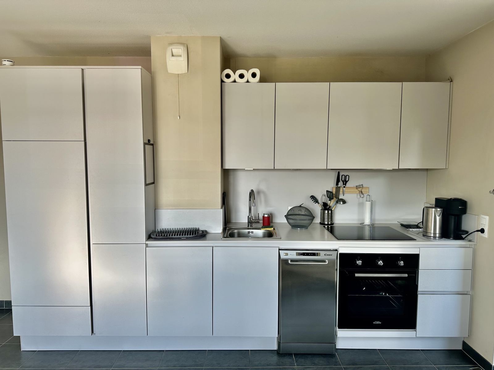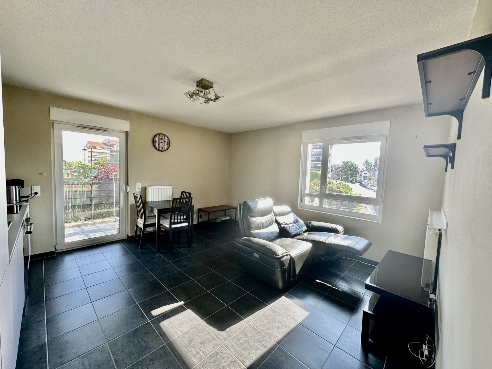 Cuisine équipée ouverte sur un séjour lumineux avec accès balcon